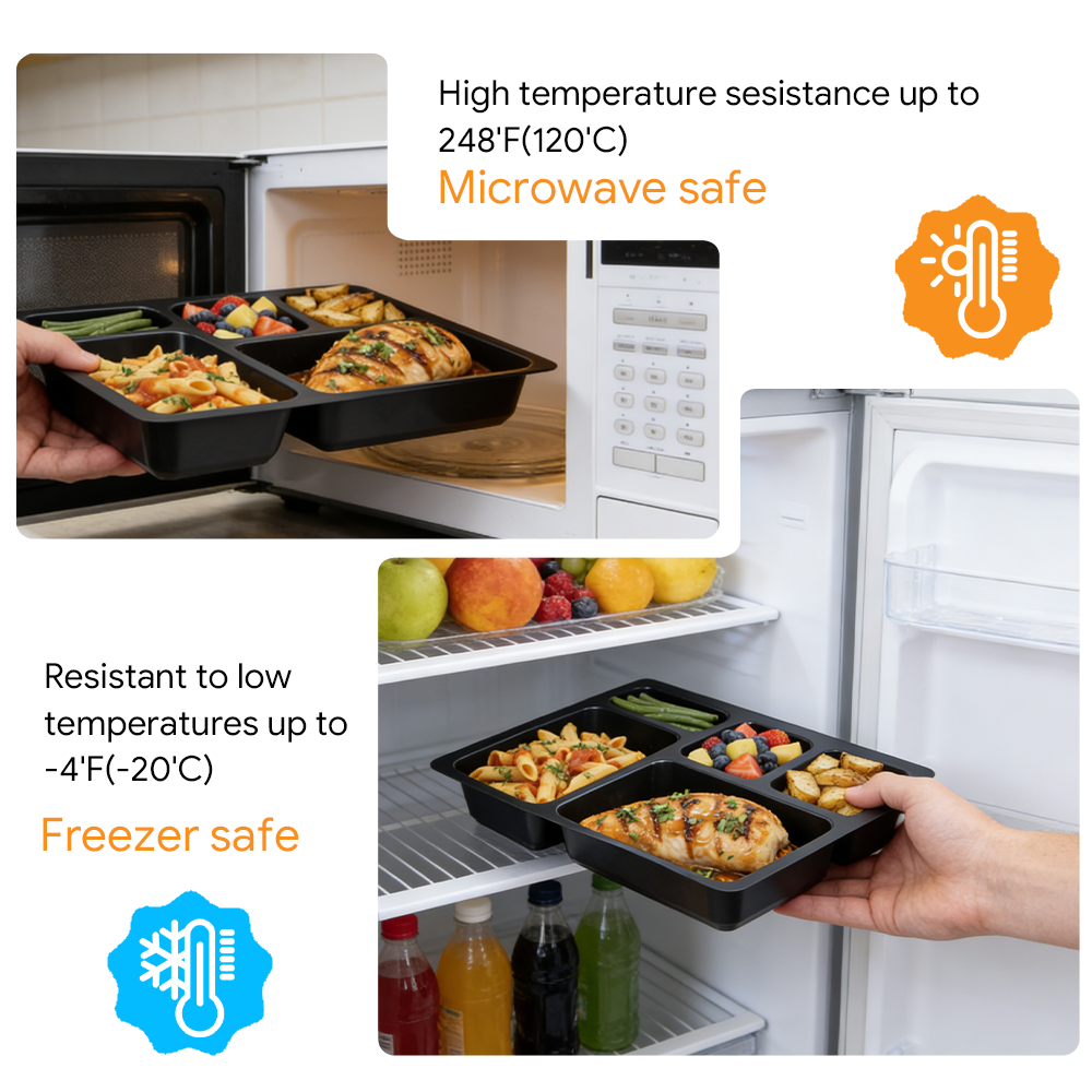 - Stackable & Leak-Resistant: Sturdy walls and secure compartment edges prevent spills and enable space-saving stacking in fridges, freezers, and delivery bags.