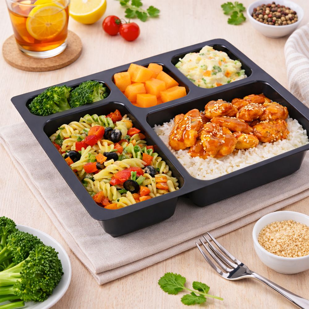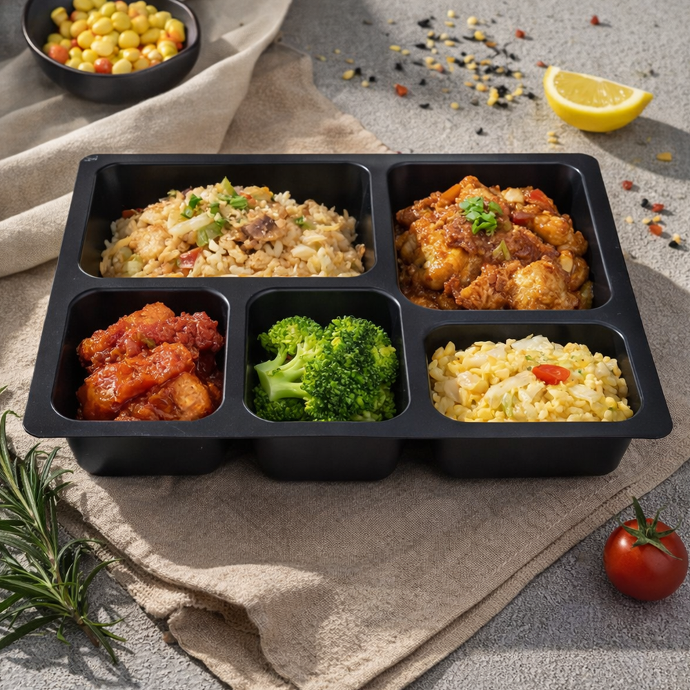 Elevate your meal prep, catering, and food delivery operations with our heavy-duty 5-compartment PP containers—engineered for convenience, durability, and brand consistency.