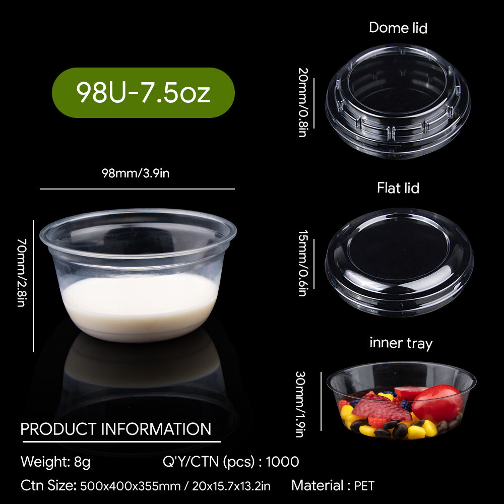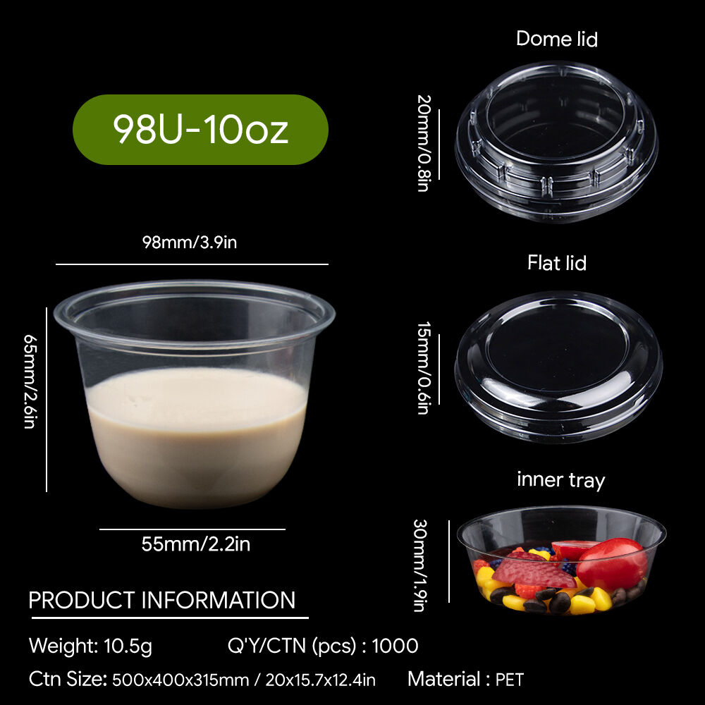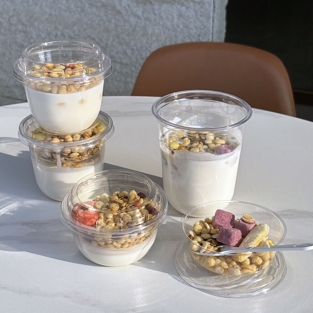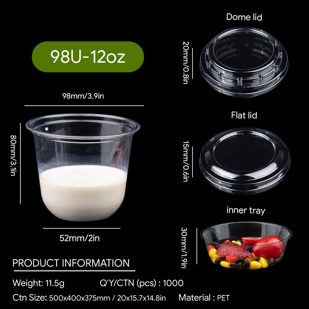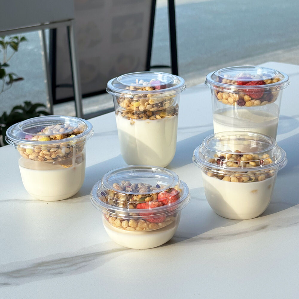 Bizning PET qatiq stakanlarimiz zamonaviy qulaylik va yangilikni saqlash uchun mo'ljallangan. Ular ikkita qavatli tuzilishga bilan o'rta bo'linmaga ega bo'lib, xizmat ko'rsatishdan oldin aralashmaslik sharti bilan qatiq, don, mevalar yoki qo'shimchalar bilan birgalikda ishlatish uchun ajoyibdir. Ulardan tayyorlangan ovqat sifatidagi PET materiali xavfsizlik, aniq ko'rinish va mahsulotingizni ajoyib taqdim etishni kafolatlaydi.