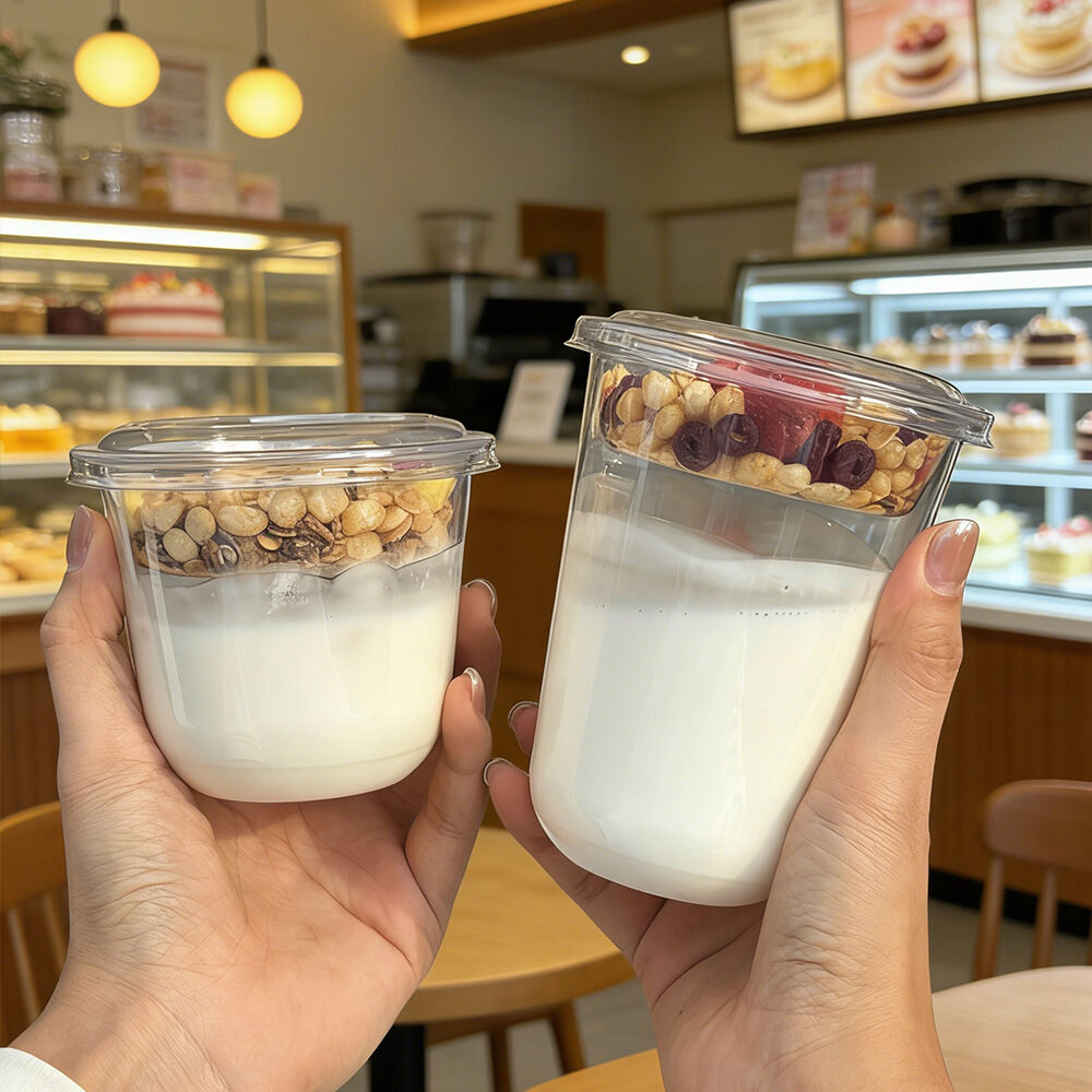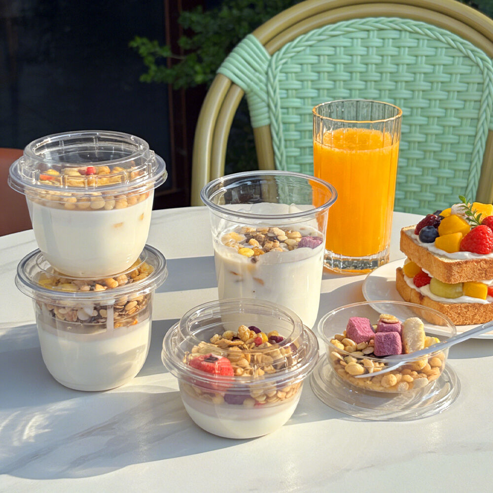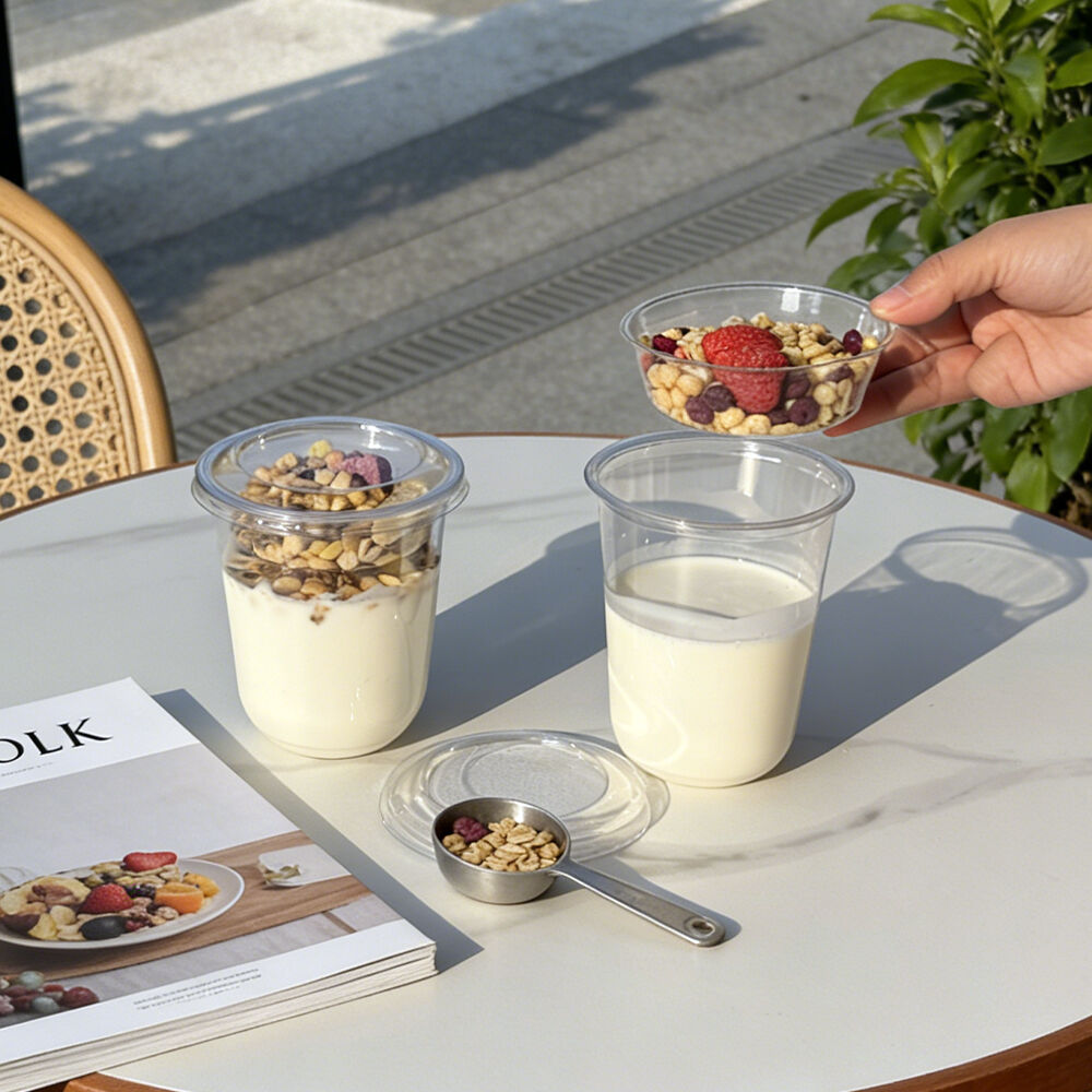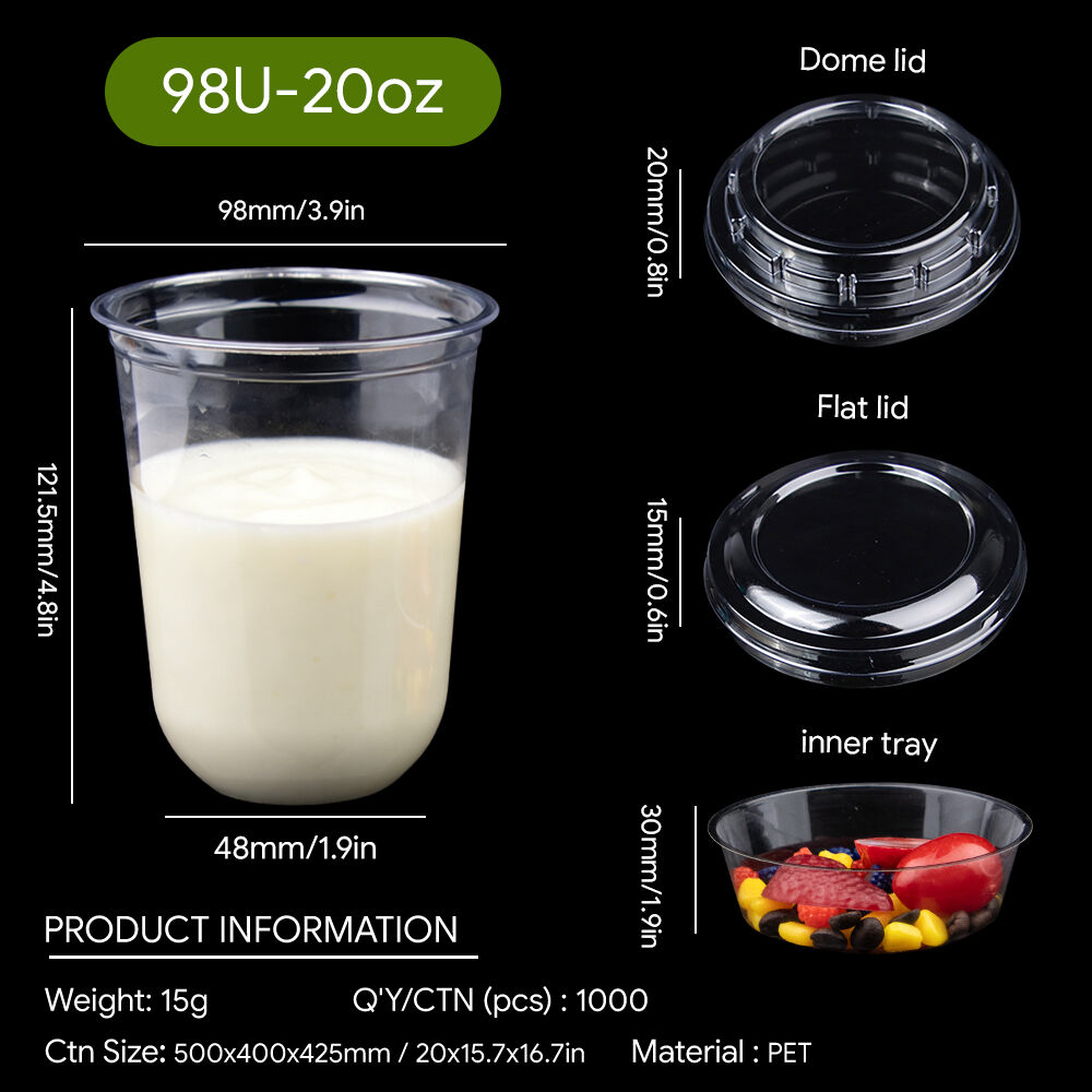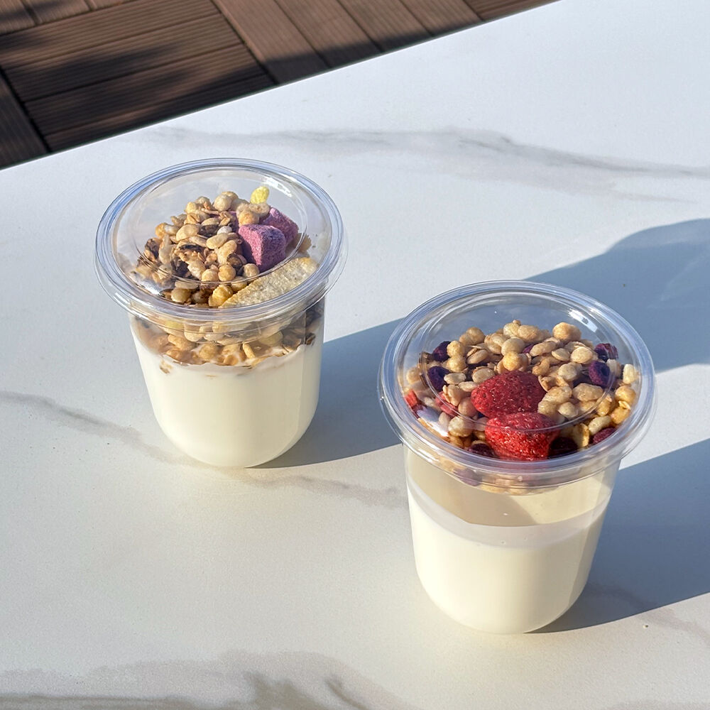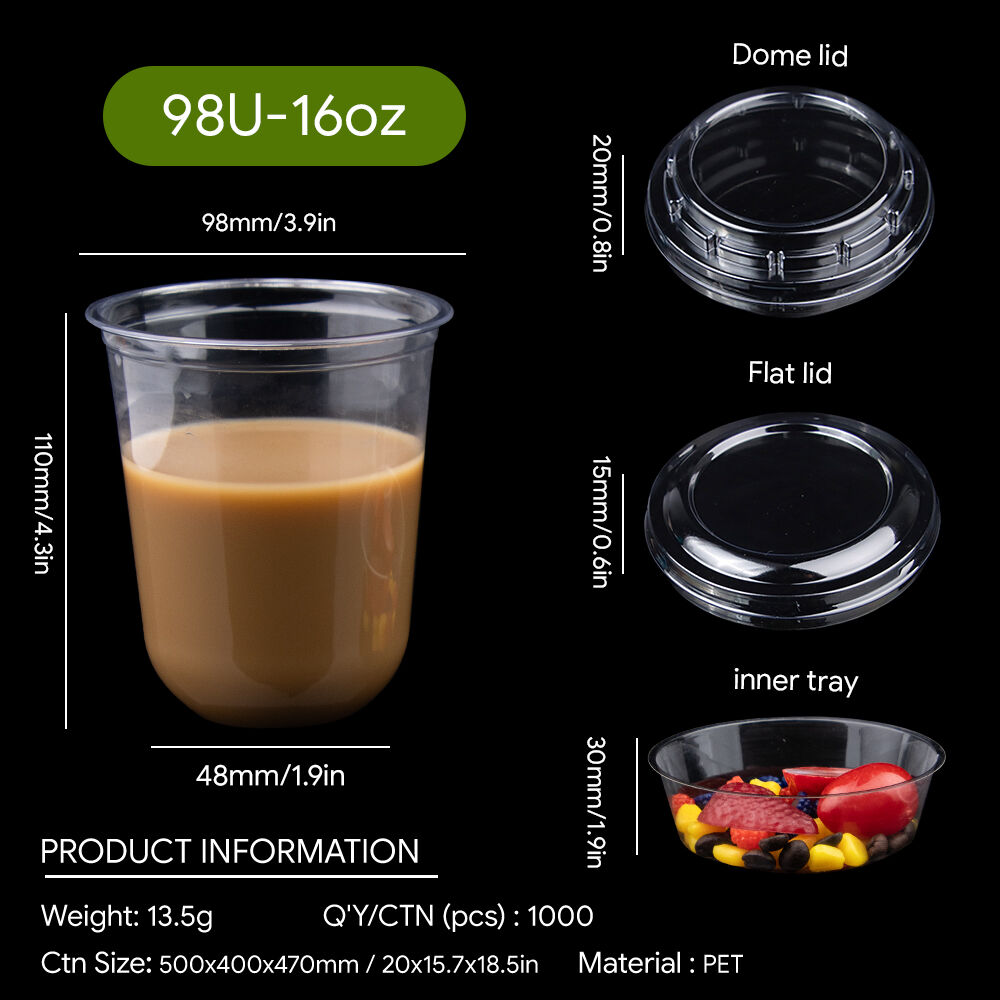 Bizning PET qatiq stakanlarimiz zamonaviy qulaylik va yangilikni saqlash uchun mo'ljallangan. Ular ikkita qavatli tuzilishga bilan o'rta bo'linmaga ega bo'lib, xizmat ko'rsatishdan oldin aralashmaslik sharti bilan qatiq, don, mevalar yoki qo'shimchalar bilan birgalikda ishlatish uchun ajoyibdir. Ulardan tayyorlangan ovqat sifatidagi PET materiali xavfsizlik, aniq ko'rinish va mahsulotingizni ajoyib taqdim etishni kafolatlaydi.